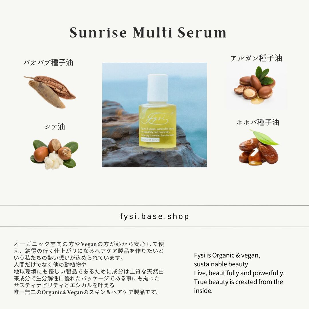 日々のヘアケアやスキンケアにぜひ取り入れてみてください。Fysi sunrise multiserumと共に、新たな自分との出会いを楽しんでいただけることでしょう。